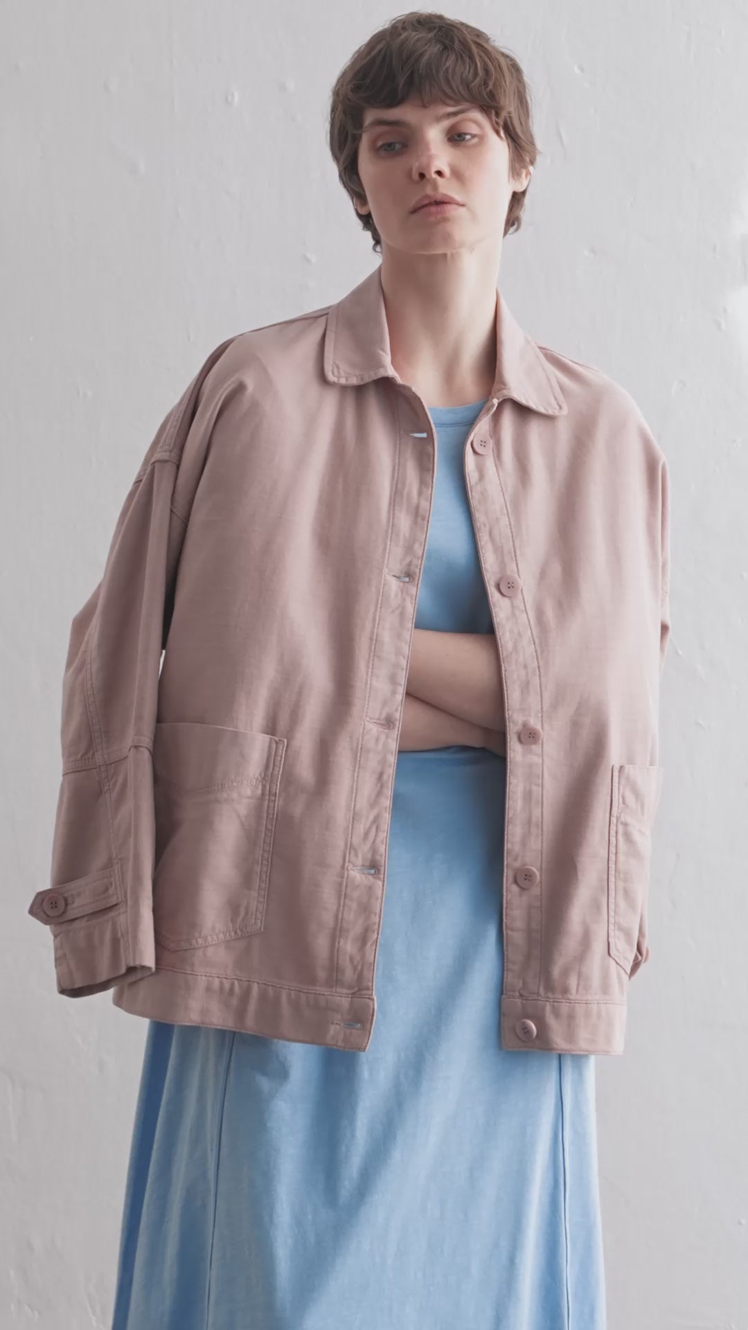 Our oversized cotton jacket is made from a cotton elastane blend, offering a defined yet relaxed feel. Designed with a point collar and top-stitched patch pockets, it features sustainable Corozo buttons and adjustable buttoned cuffs, garment-dyed for a rich depth of color.