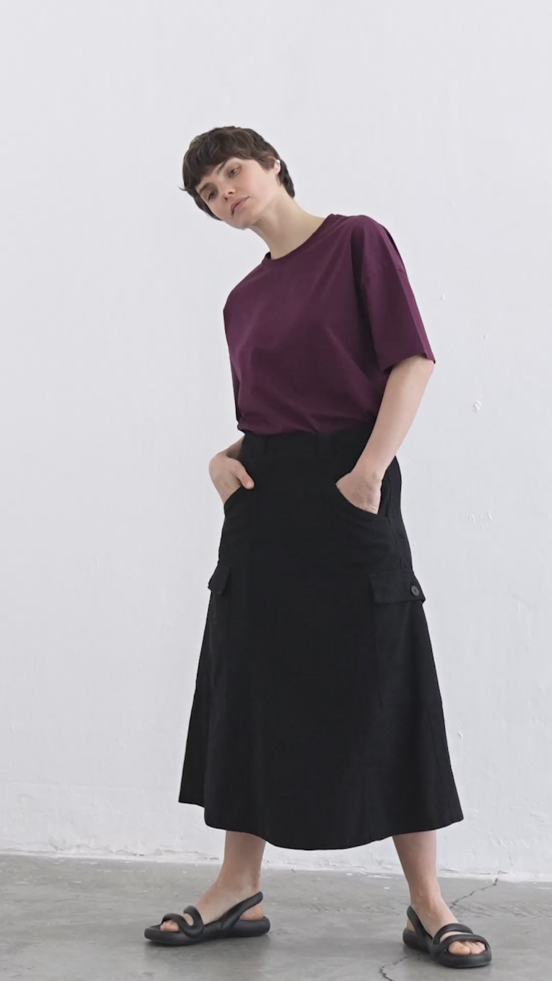 Our utility midi skirt is garment-dyed for a rich depth of color, designed with a mid-rise waist and an A-line shape for a structured yet effortless look. Crafted from a cotton elastane blend, it features a side zip closure, sustainable Corozo buttons, belt loop detail, side top-stitched flap pockets, and front slash pockets for added functionality.